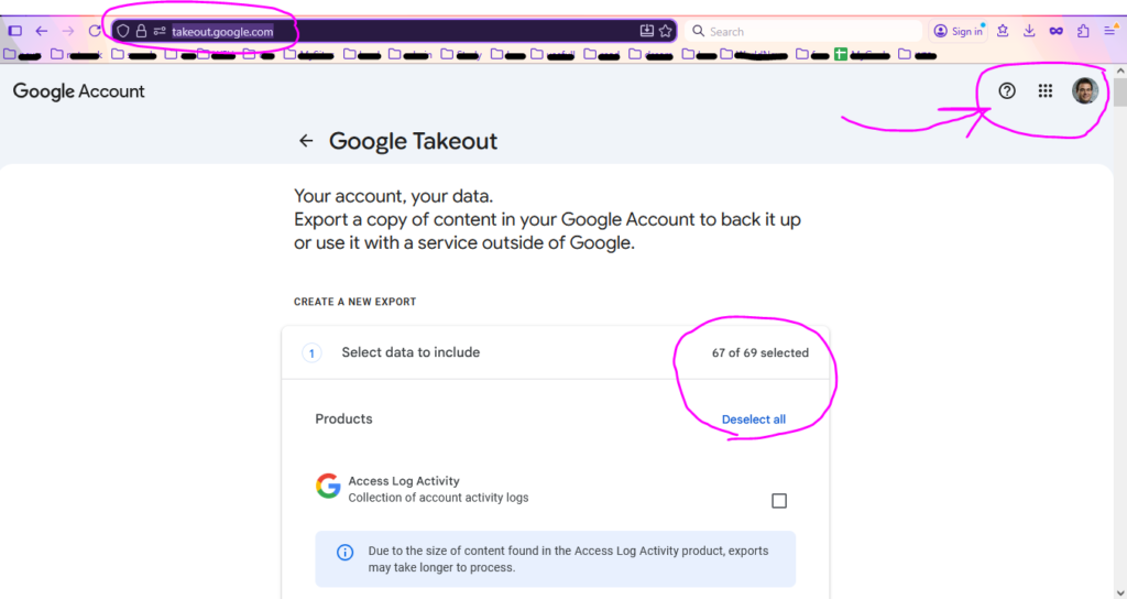 לבטל בחירה של כל השירותים – אין צורך בגיבוי של כולם. המלצה שלי לגבות בנפרד את התמונות, הדוא"ל, היומן ואנשי הקשר, הכונן drive. אפשר להכנס שוב פעם ל takeout. אז בפעם הראשונה לגבות את הדוא"ל (gmail) בפעם השנייה את היומן ואנשי הקשר, בפעם השלישית את התמונות וכך הלאה.